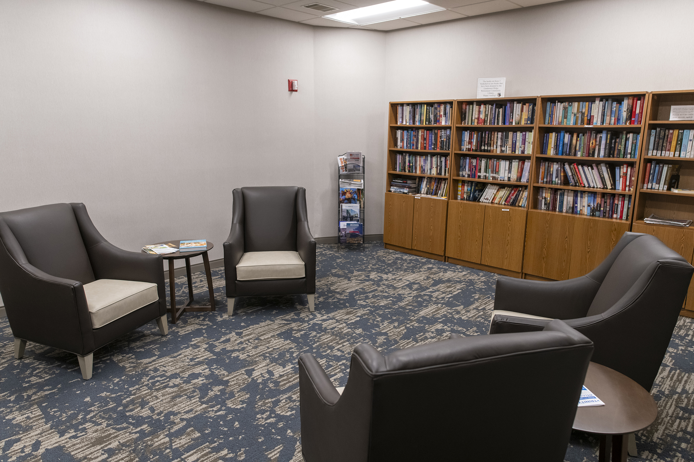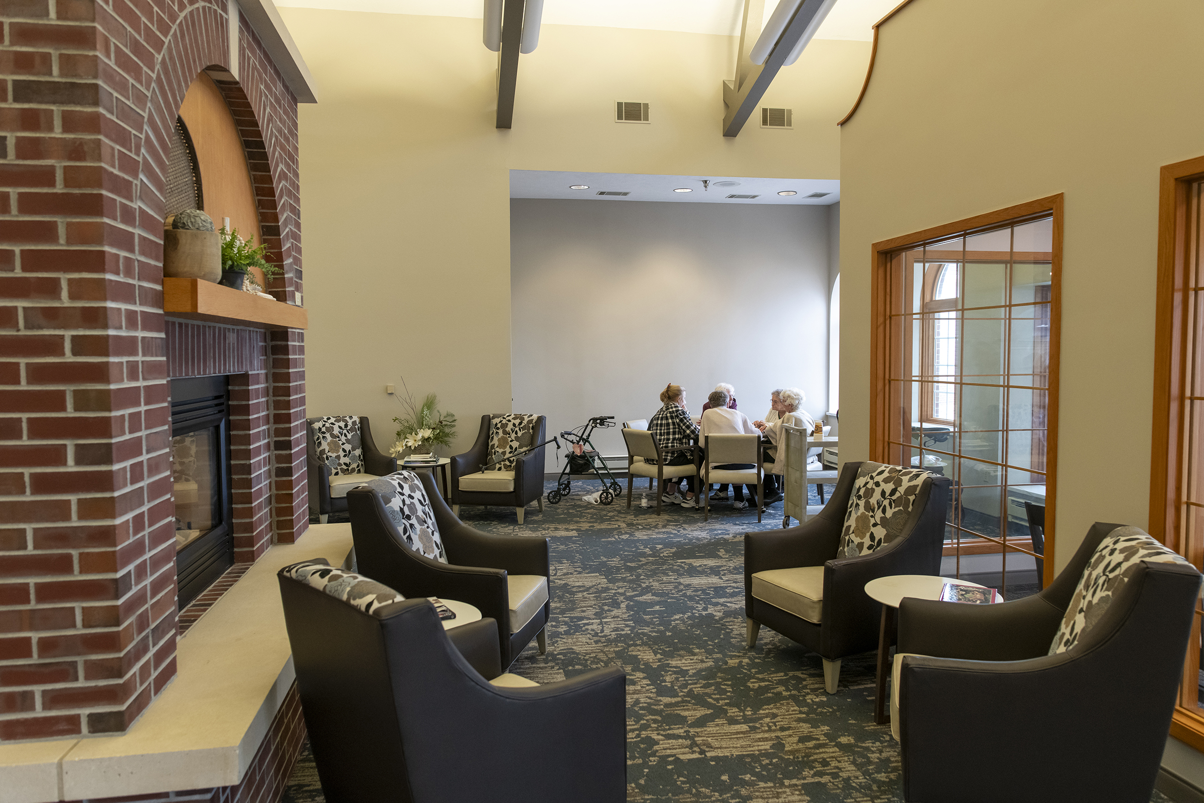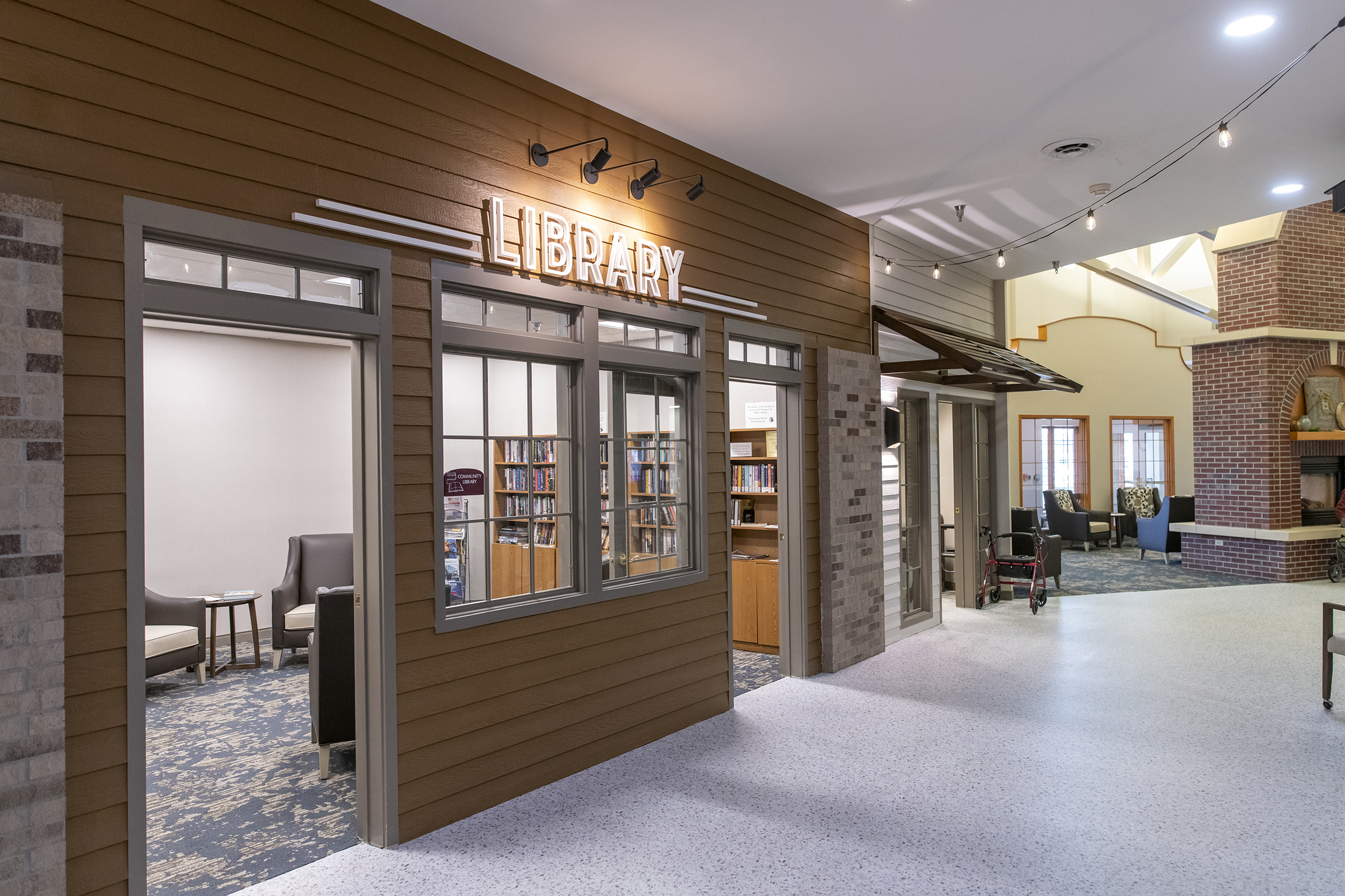 Upon entering Landsmeer Ridge Retirement Community, the Fireside Room welcomes you with a large fireplace and sitting room. Down the hall you will find the Treat Shoppe, a popular place among residents and guests, that offers ice cream cones, popcorn, cappuccinos, hot chocolate, and cold drinks. The Orange City Public Library visits monthly to replenish the library's books. Residents often read, work on jigsaw puzzles, or use the computer. If you need some pampering, the salon offers various services, from haircuts to washing and sets to perms. The private dining room, comfortably seating ten, is conveniently located for residents of both the Independent and Assisted living areas. You can reserve it to entertain guests and enjoy a served meal. The Community Court provides a spacious area for educational presentations, musical events, and wine and cheese gatherings. It also serves as a general hangout spot for visitors. Residents are welcome to reserve this room for gatherings with friends and family. Administration offices are easily accessible to residents and visitors for needs, such as assistance with the local RIDES van, questions regarding local events, or registering an apartment repair need.